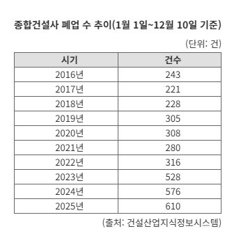 11일 건설산업지식정보시스템에 따르면 올해 1월 1일부터 12월 10일까지 폐업을 신고한 종합공사업 수는 610건이다. 한 달에 50건 이상, 하루 1.6건 이상 발생하는 셈이다.
