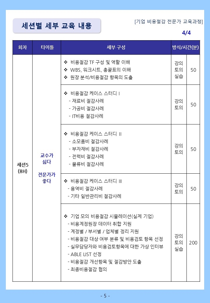 • 효율적이고 지속 가능한 비용 절감 솔루션을 제공하고, 비용절감에 대한 이론적 이해와 실제 적용 방법을 습득하여 기업의 비용 구조 개선의 실질적인 문제 해결 능력을 강화하는 전문가 교육과정입니다. 3 0 오이마켓 정원연 wonyon@empas.com 정원연의 기사 더보기 저작권자 ⓒ 기술과가치, 무단 전재 및 재배포 금지