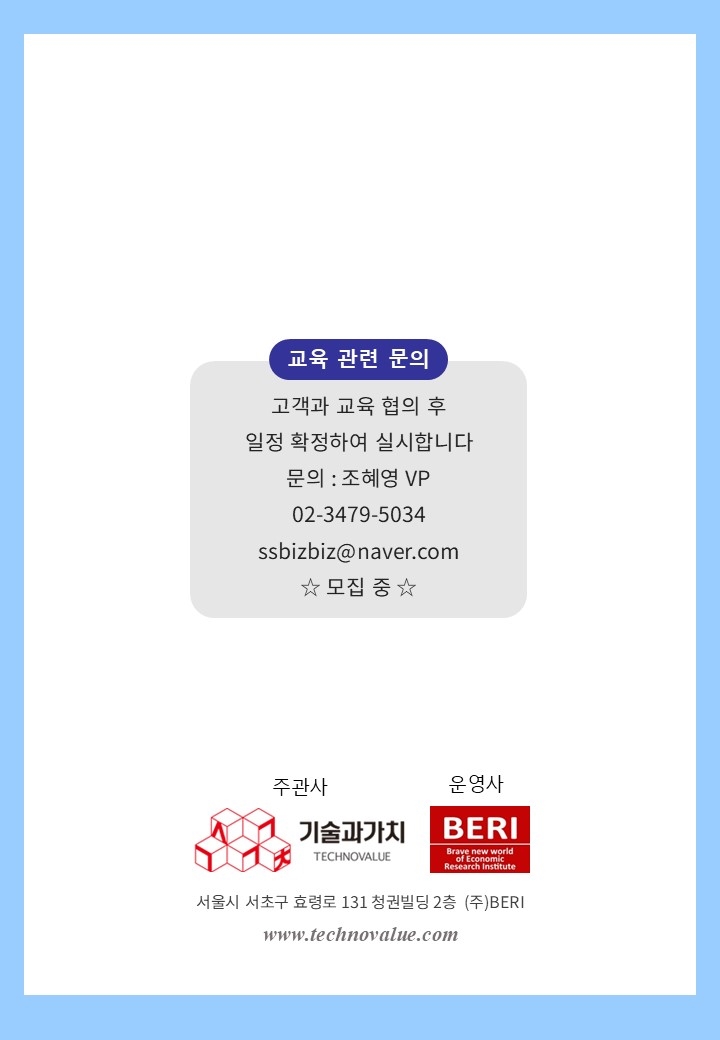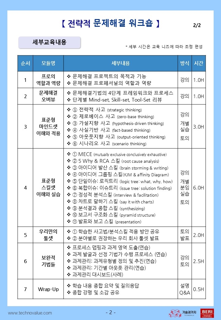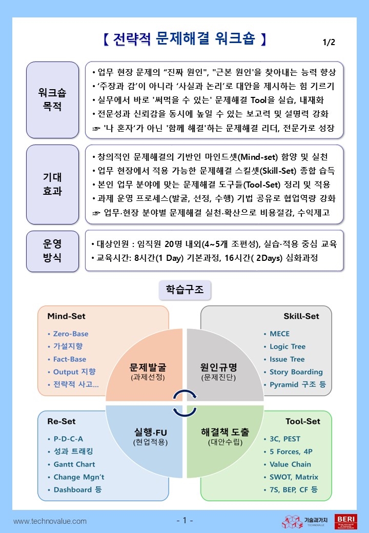 <교육 내용> • 업무 현장 문제의 “진짜 원인", "근본 원인'을 찾아내는 능력 향상 • ‘주장과 감’이 아니라 ‘사실과 논리’로 대안을 제시하는 힘 기르기 • 실무에서 바로 '써먹을 수 있는' 문제해결 Tool을 실습, 내재화 • 전문성과 신뢰감을 동시에 높일 수 있는 보고력 및 설명력 강화 2 0 오이마켓 정원연 wonyon@empas.com 정원연의 기사 더보기 저작권자 ⓒ 기술과가치, 무단 전재 및 재배포 금지