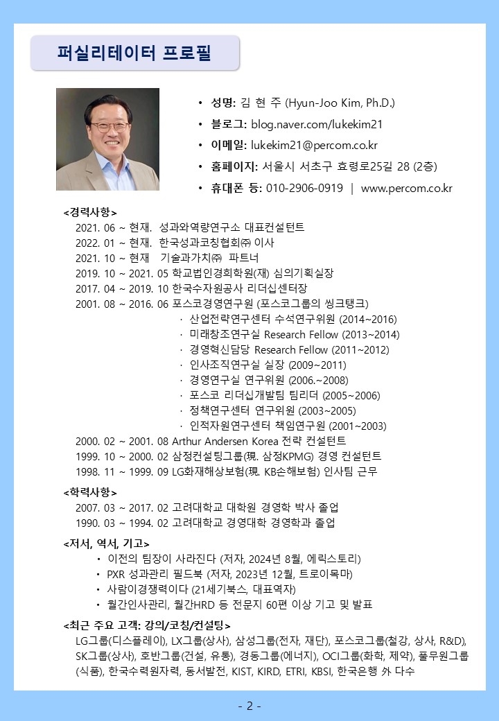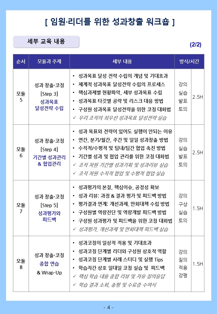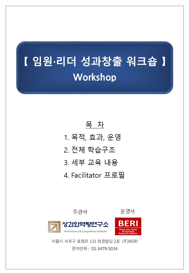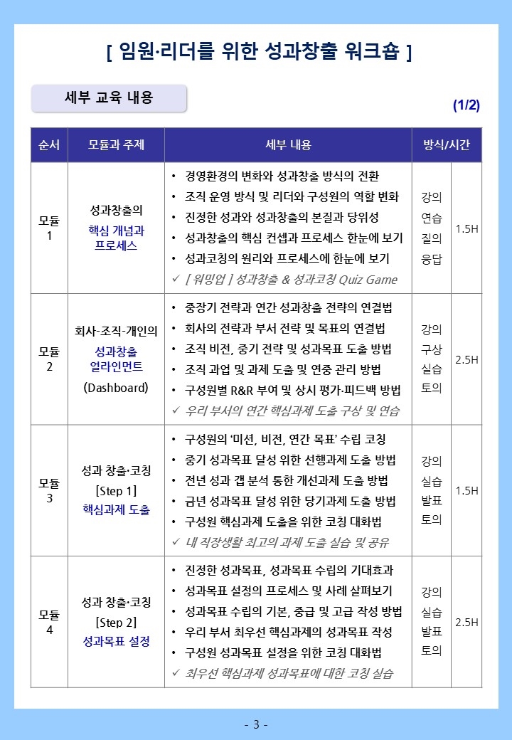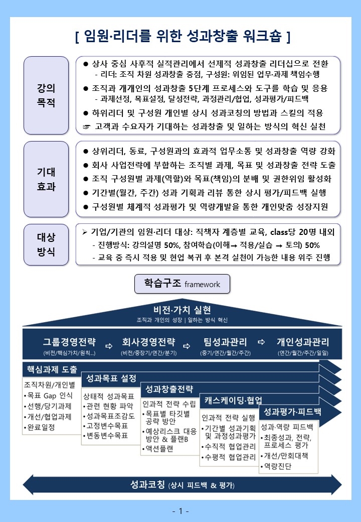 <교육 내용> · 상사 중심 사후적 실적관리에서 선제적 성과창출 리더십으로 전환 · 조직과 개개인의 성과창출 5단계 프로세스와 도구를 학습 및 응용 · 하위리더 및 구성원 개인별 상시 성과코칭의 방법과 스킬의 적용 1 0 오이마켓 정원연 wonyon@empas.com 정원연의 기사 더보기 저작권자 ⓒ 기술과가치, 무단 전재 및 재배포 금지