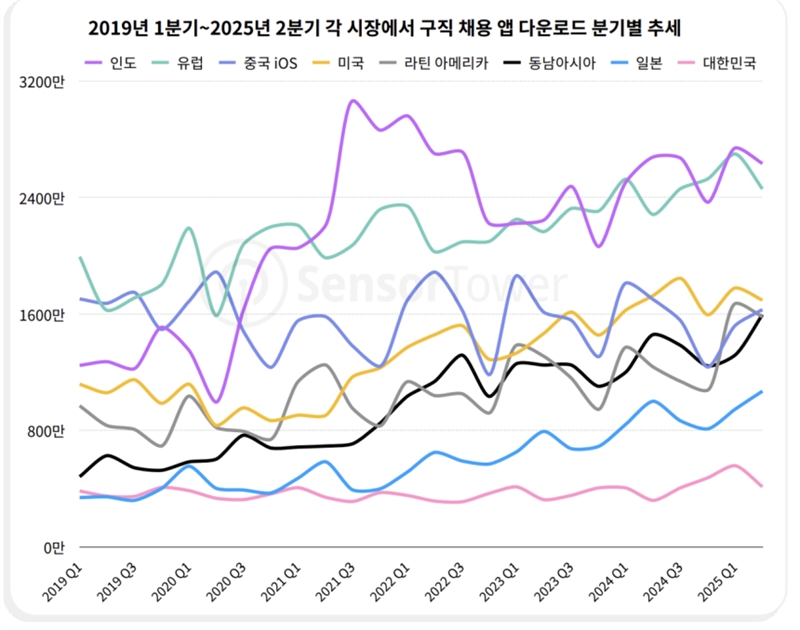 19일 글로벌 시장조사업체 센서타워는 최근 몇 년 간 국가별 주요 구직·채용 앱 다운로드 현황을 집계한 결과, 올해 상반기 전 세계 구직·채용 앱 다운로드가 전년 대비 8% 증가한 것으로 나타났다고 밝혔다.
